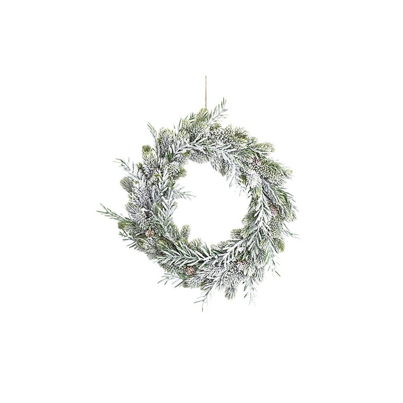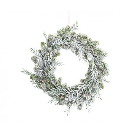 Addobbo natalizio, corona innevata rami e pigne per porta da decorare