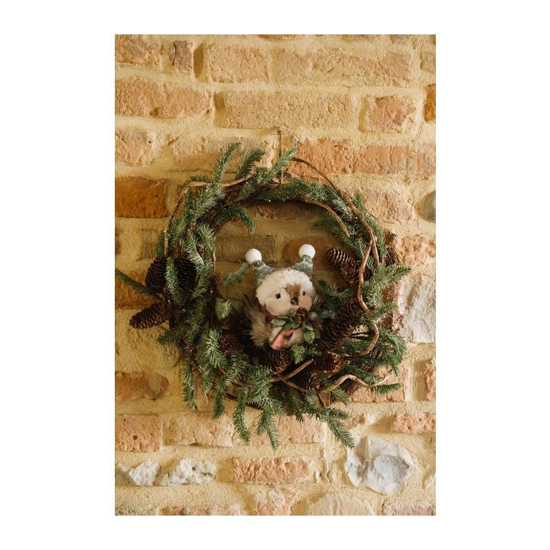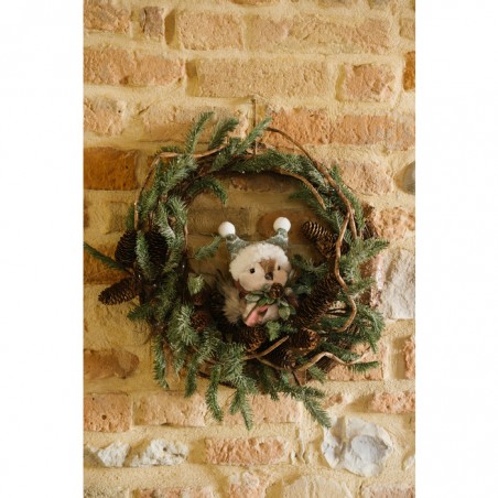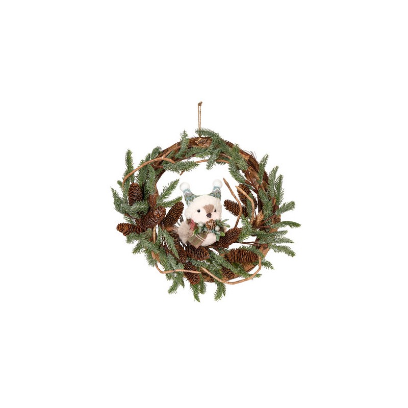 Ghirlanda rotonda con uccellino di stoffa al centro.
