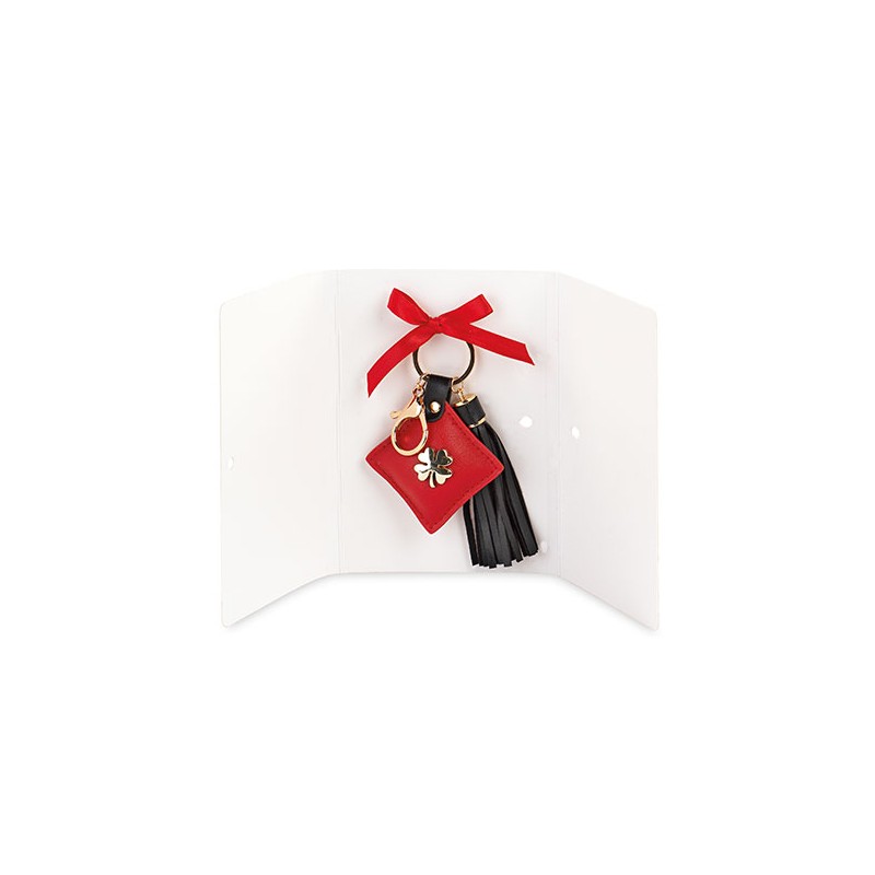 Portachiavi per la laurea a forma di nappa con quadrifoglio portafortuna tutto contenuto in una busta