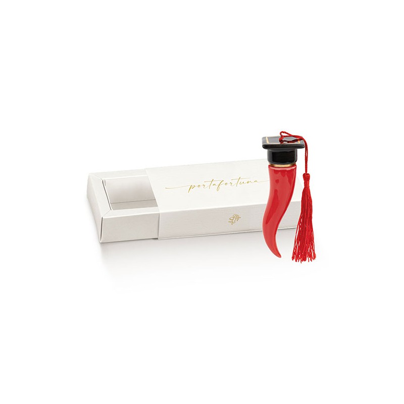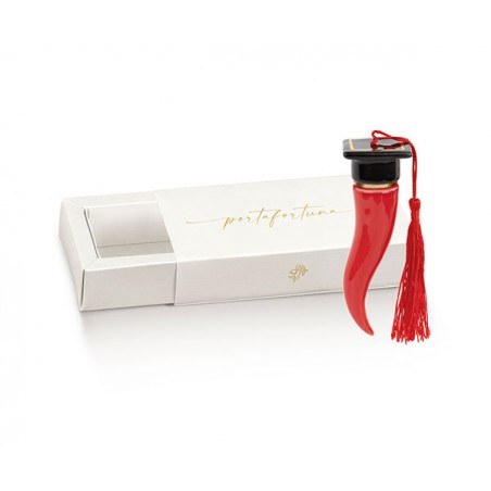 Corno portafortuna rosso con tocco, nappina e scatola regalo.