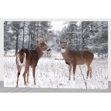 Stampa su tela con raffigurato una coppia di cervi su paesaggio boschivo innevato.