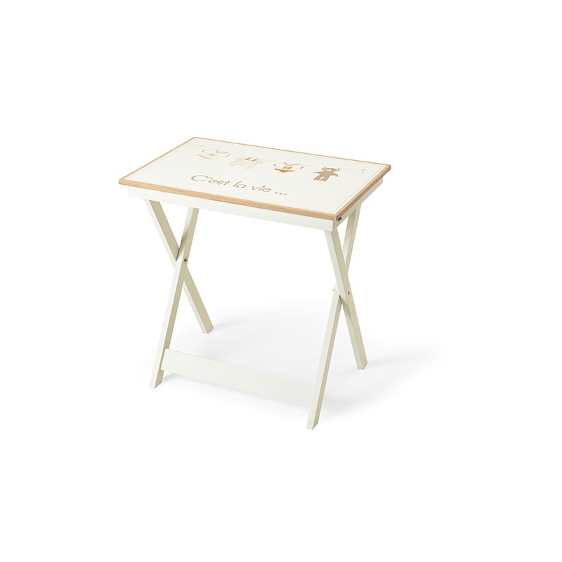 Tavolino in legno pieghevole con disegni e scritta "C'est la vie"