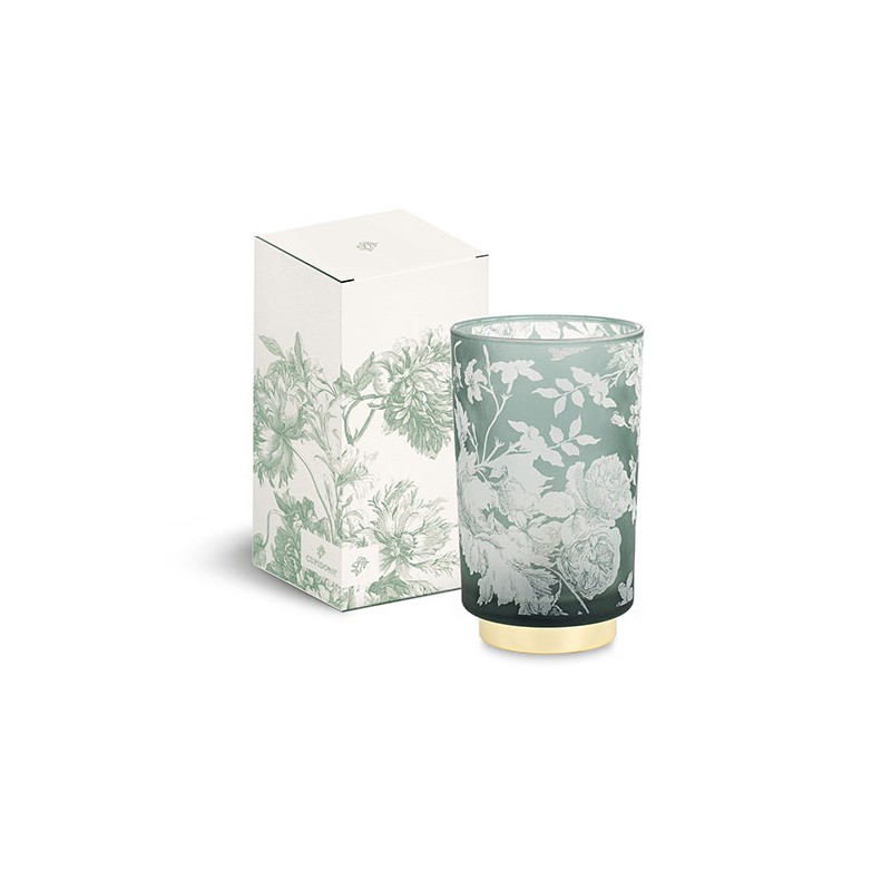 Il fascino sofisticato della luce si esprime in lampade Toile de Jouy a batteria in vetro opaco nella quale sbocciano delicate peonie e rose inglesi.