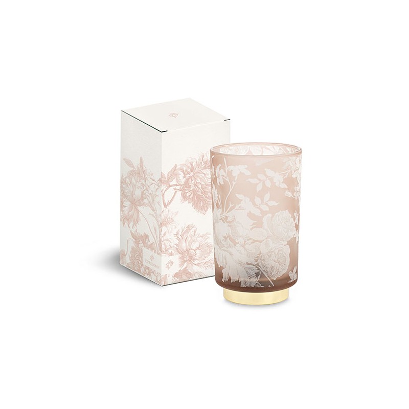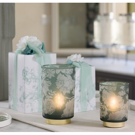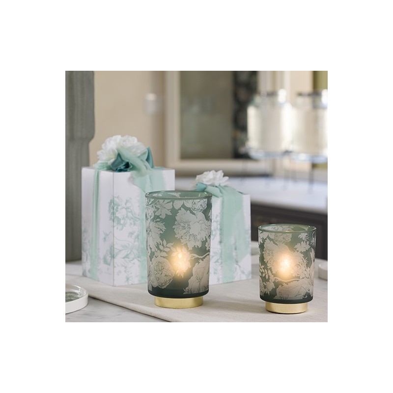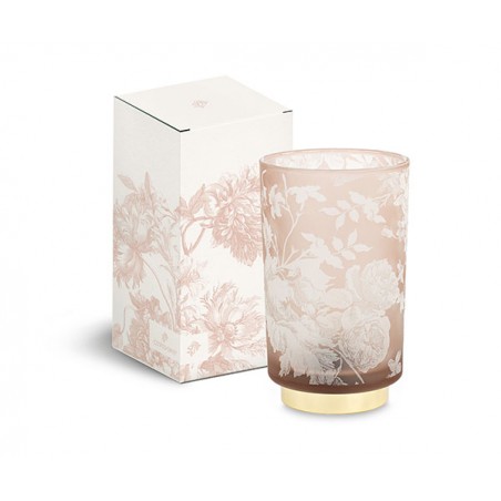 Il fascino sofisticato della luce si esprime in lampade Toile de Jouy a batteria in vetro opaco nella quale sbocciano delicate peonie e rose inglesi.