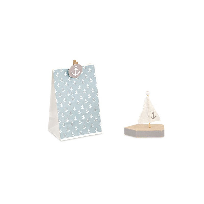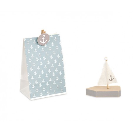 Sacchetto con disegnate delle ancore e una molletta per la chiusura, allegata una piccola barchetta stilizzata in legno.