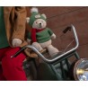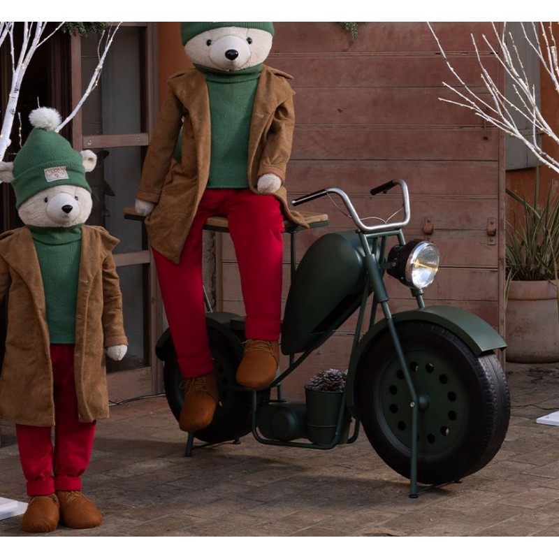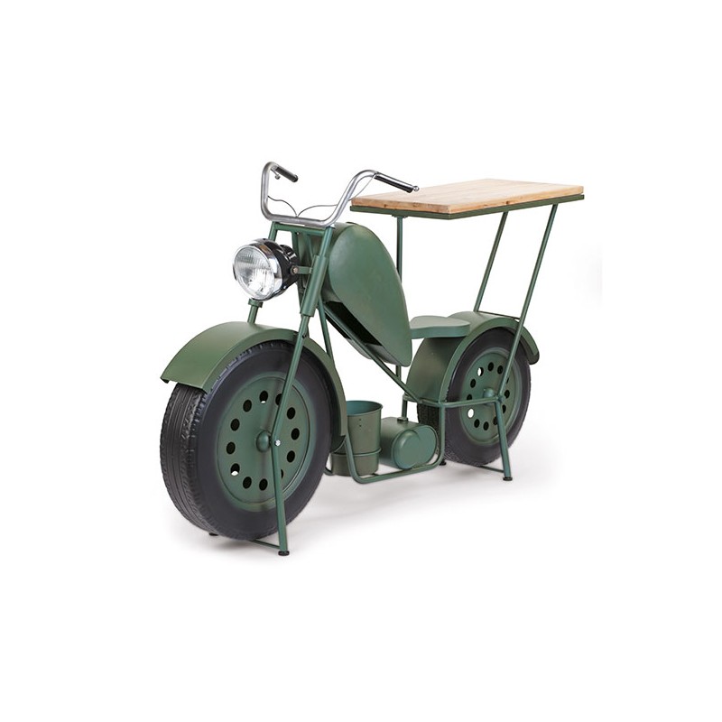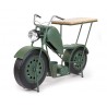 Moto vintage verde in metallo con due ripiani e faro funzionante.