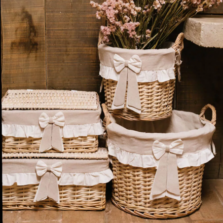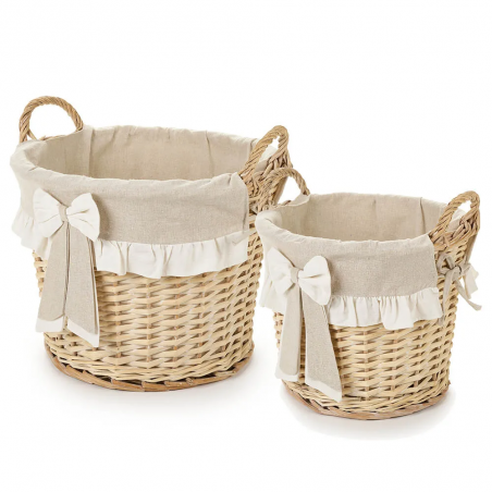 Set di 2 cesti in vimini con stoffa e coperchio.