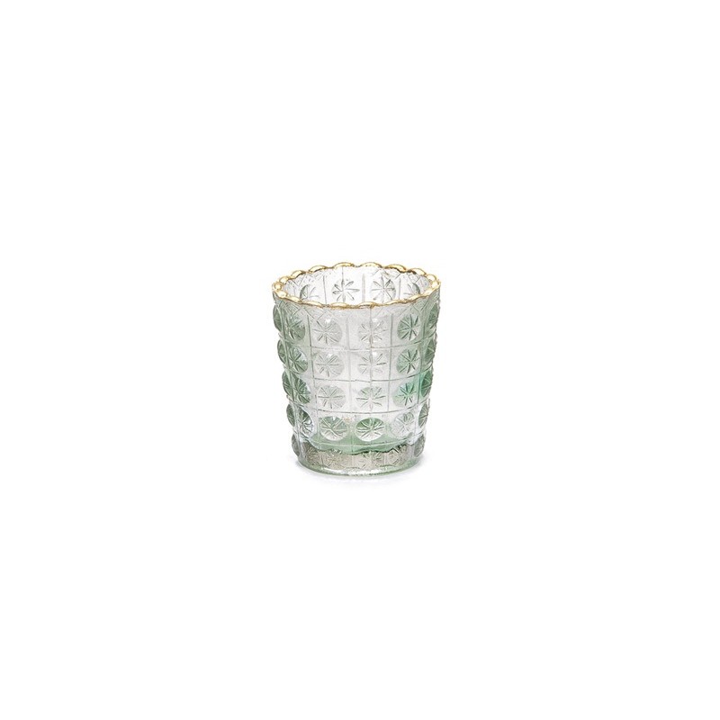 Porta tea-light in vetro verde con bordi oro.