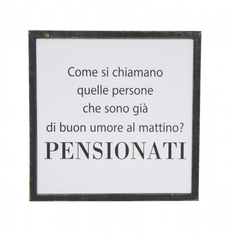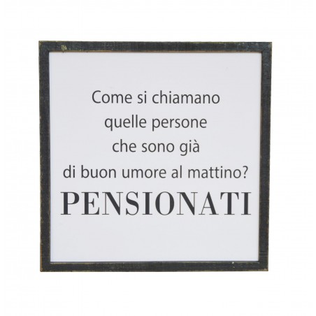Quadro in legno con scritta "come si chiamano quelle persone che sono già di buon umore al mattino? PENSIONATI" da appendere.