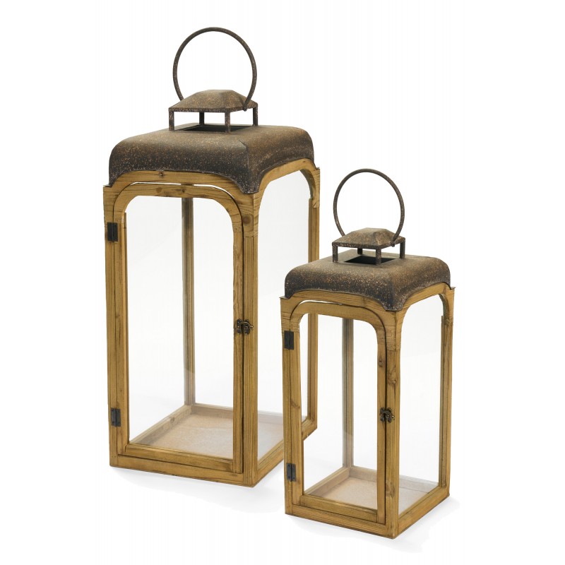 Set di 2 lanterne in legno con copertura superiore in metallo e vetro protettivo.