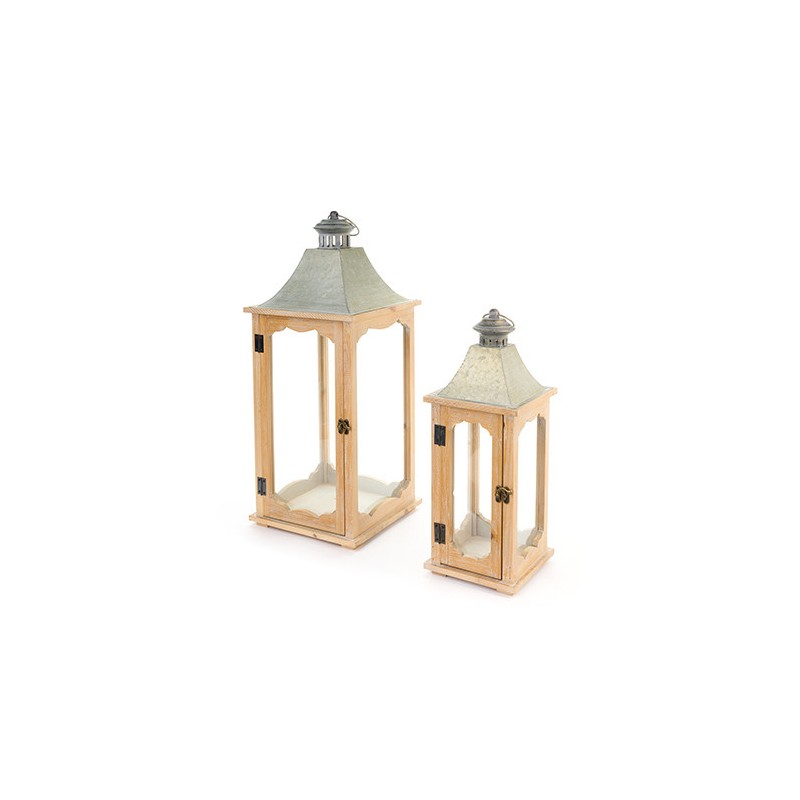 Set di 2 lanterne in legno con copertura superiore in metallo e vetro protettivo.