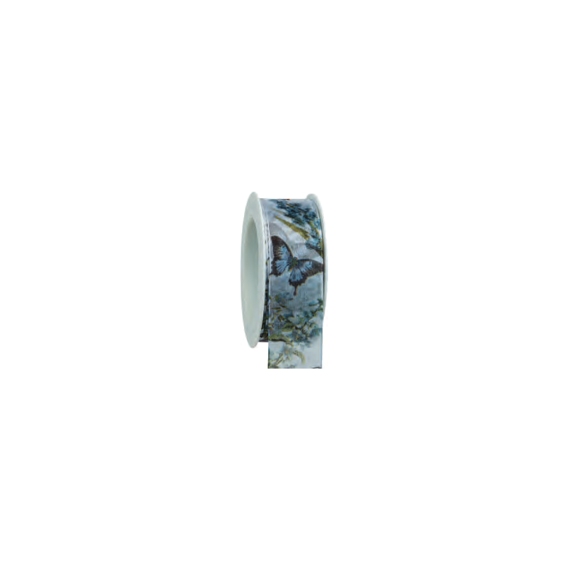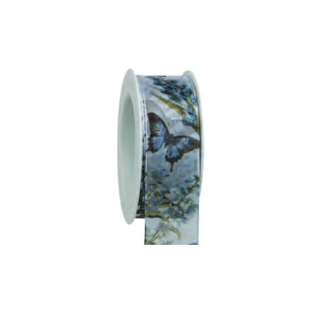 Nastro in seta con fantasia floreale e farfalle, altezza 4 cm.