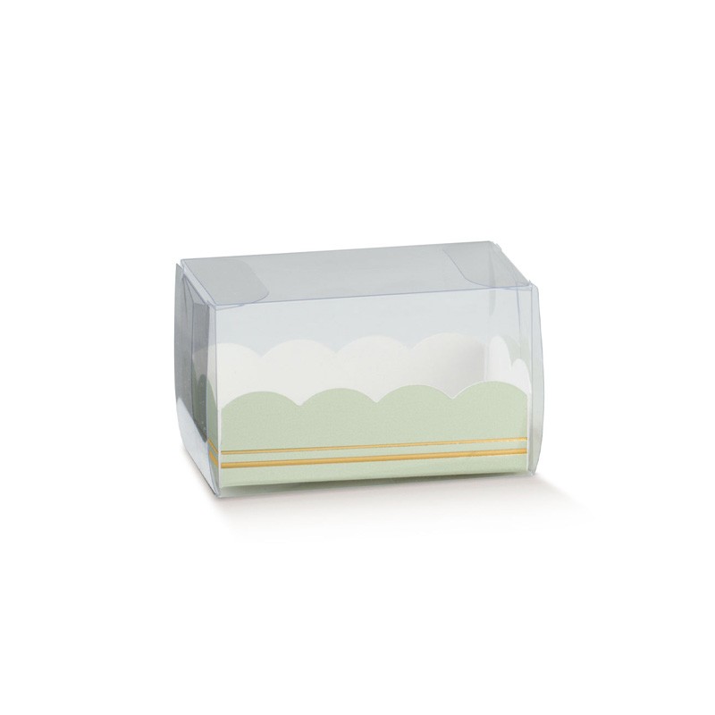 Scatolina porta macarones con base in cartoncino colorato e copertura superiore in plastica trasparente.