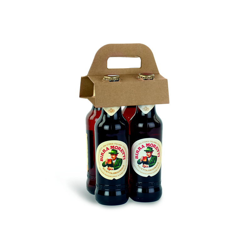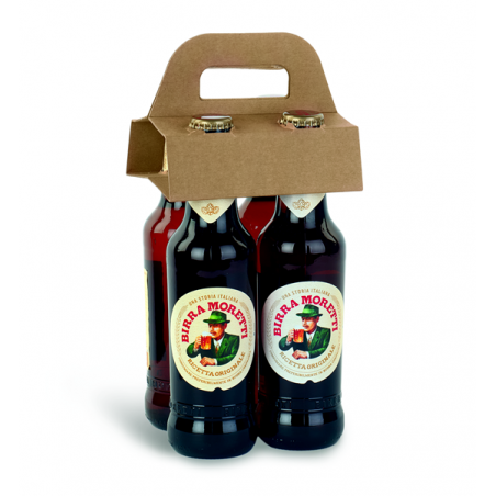Portabottiglie in cartone accoppiato per contenere 4 bottiglie di birra.