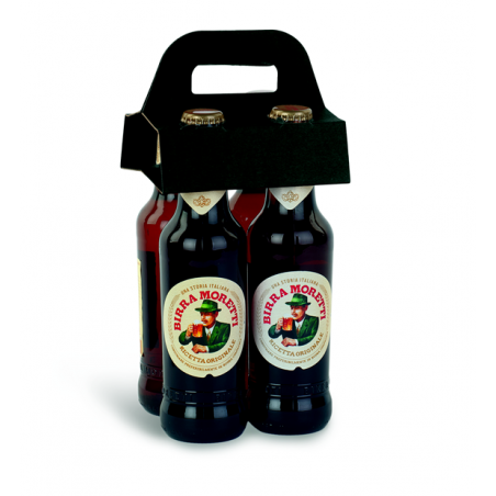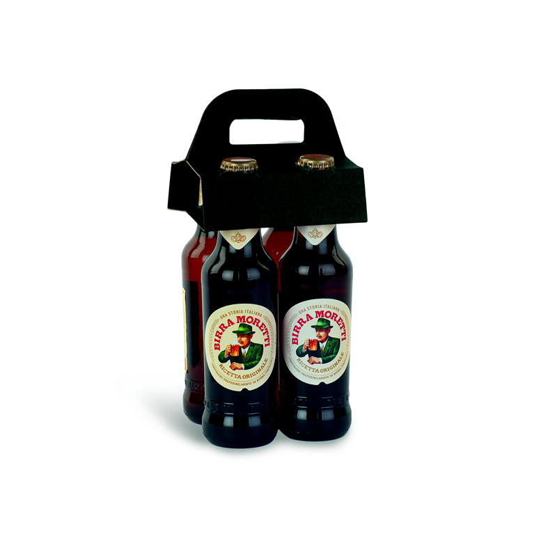 Portabottiglie in cartone accoppiato per contenere 4 bottiglie di birra.