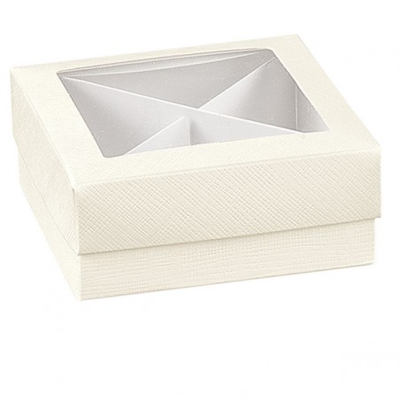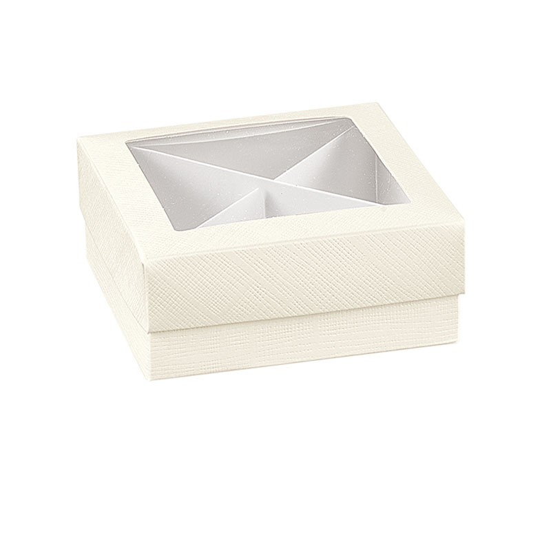 Scatolina per bomboniere quadrata con coperchio e finestra, all'interno si può montare un piccolo divisorio per separare i diversi contenuti.