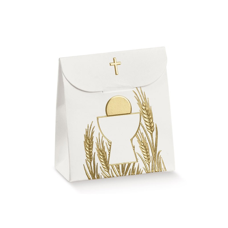 Porta confetti a forma di sacchettino con croce dorata.