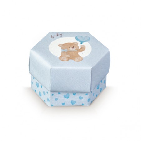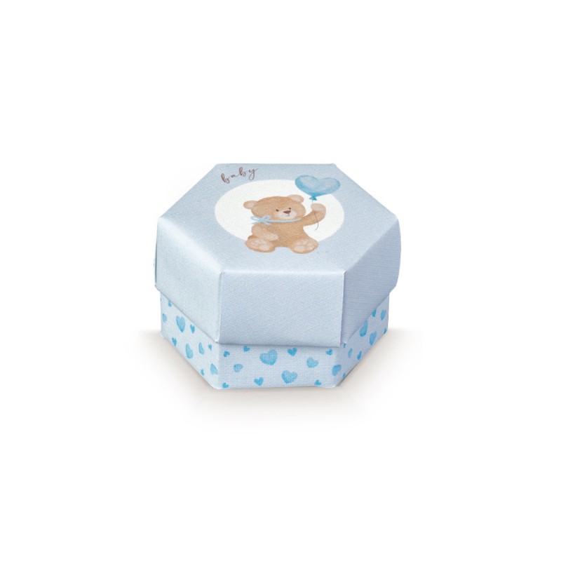 Scatolina per bomboniere esagonale con coperchio e disegno di un orsetto.