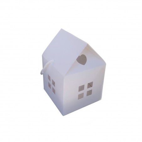 Bomboniera a forma di casetta con cordino colore lino bianco.