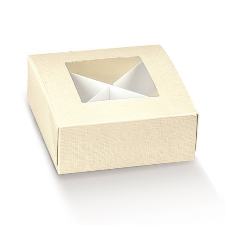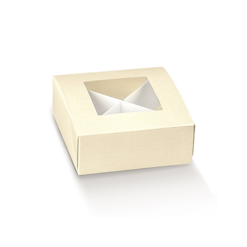 Scatolina per bomboniere quadrata con finestra in stile pratica di colore avorio.