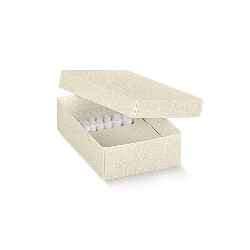 Scatolina per bomboniere rettangolare in trama pelle bianca con all'interno un astuccio in pvc per contenere i confetti.