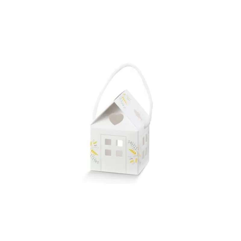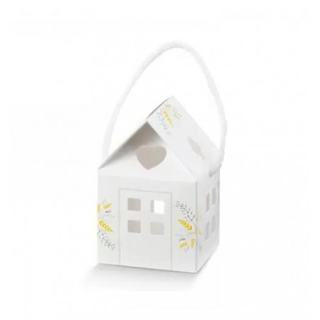 Bomboniera a forma di casetta con cordino e motivi floreali primaverili con tema comunione.