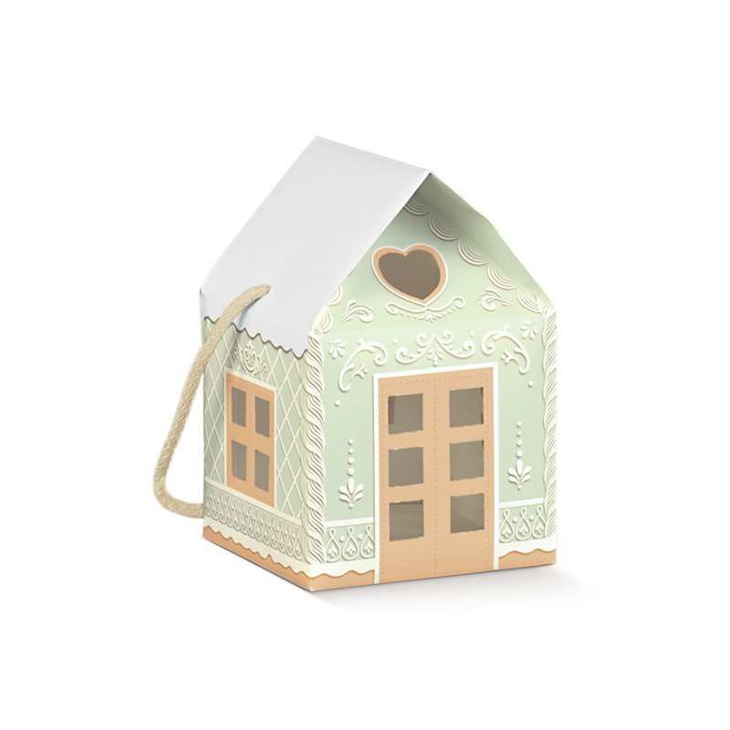 Scatola a forma di casetta con cordino.