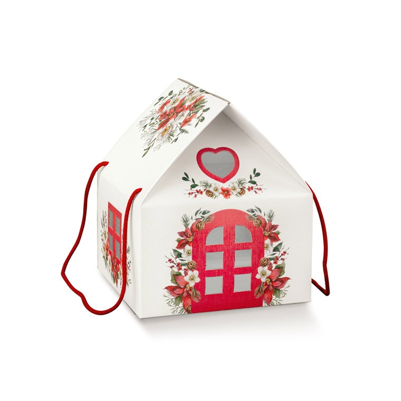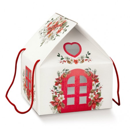 Scatola natalizia a forma di casetta con cordino.