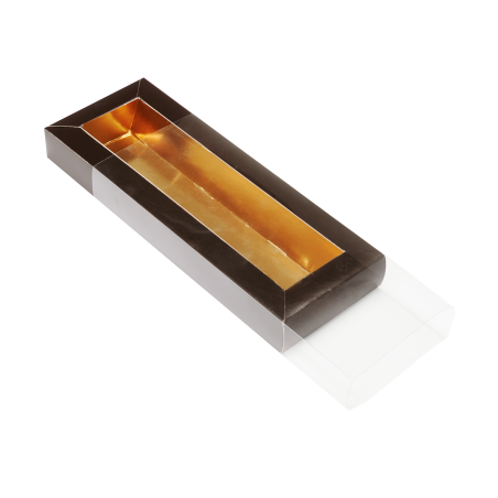 Il binario in cartoncino dorato dona eleganza alla scatola mentre il coperchietto trasparente, sfilabile di lato, permette di mostrare il contenuto mantenendone la conservazione.