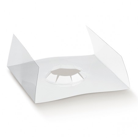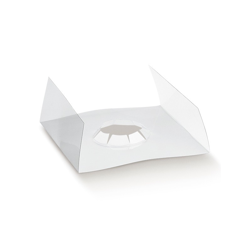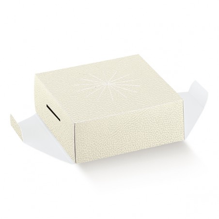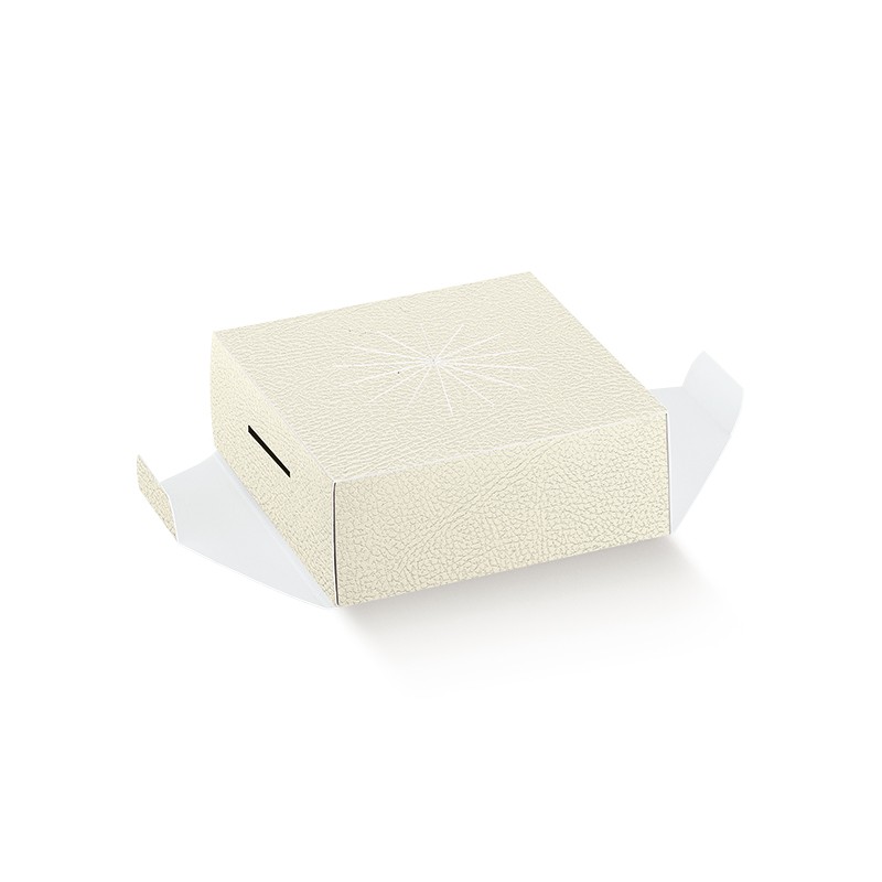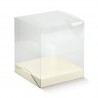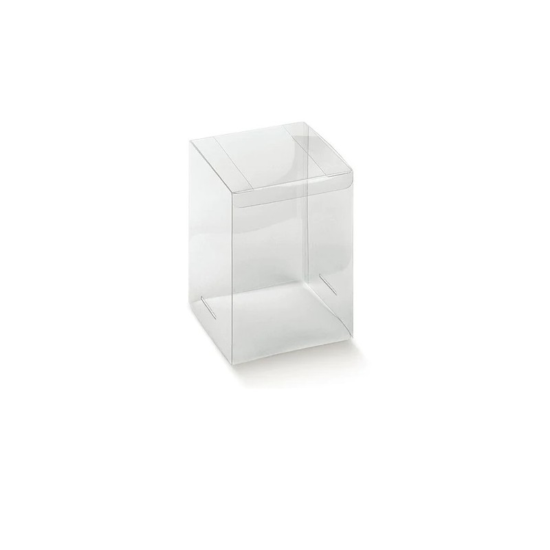 Scatola in pvc trasparente con fondo color pelle bianca in cartone accoppiato, ad astuccio.